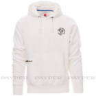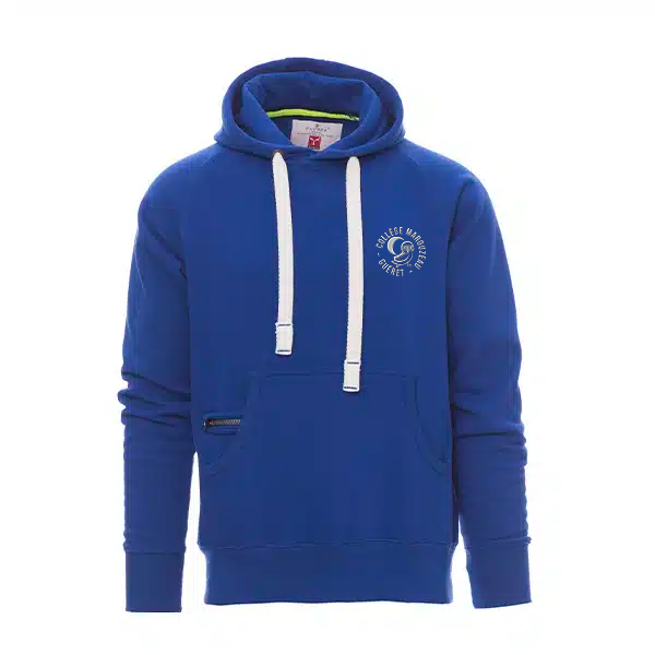 Sweat-shirt homme avec capuche à deux coutures et coulisse en cordon blanc à coutures teinte assortie et anneaux en métal . Manches raglan, couture esthétique en V au col, poches kangourou, petite poche zippée, poignets et taille en côtes élastiques, coutures renforcées.